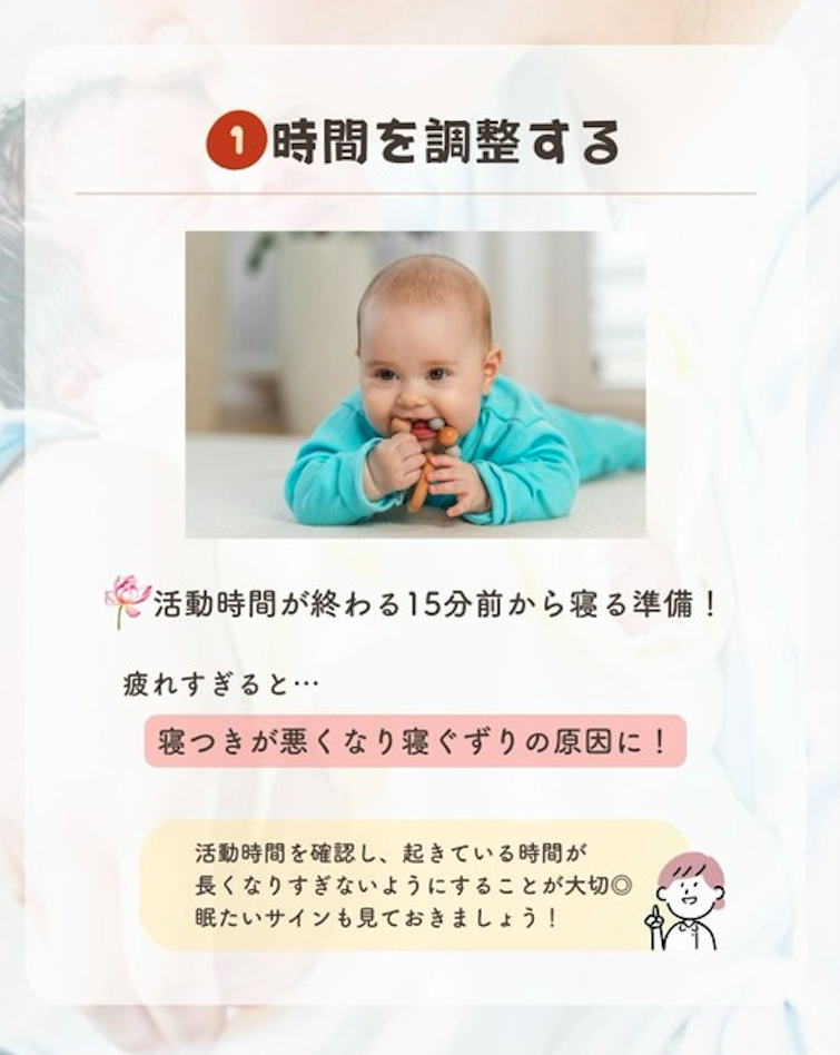 月齢に合ったタイミングで寝かしつけを行うことが、スムーズな入眠につながります。