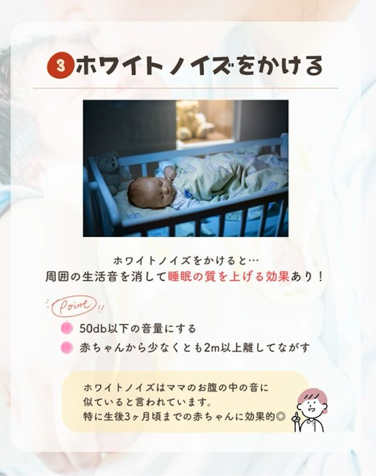 ホワイトノイズは赤ちゃんが安心しやすい音とされており、胎内の環境に近い状態を作ることができます。