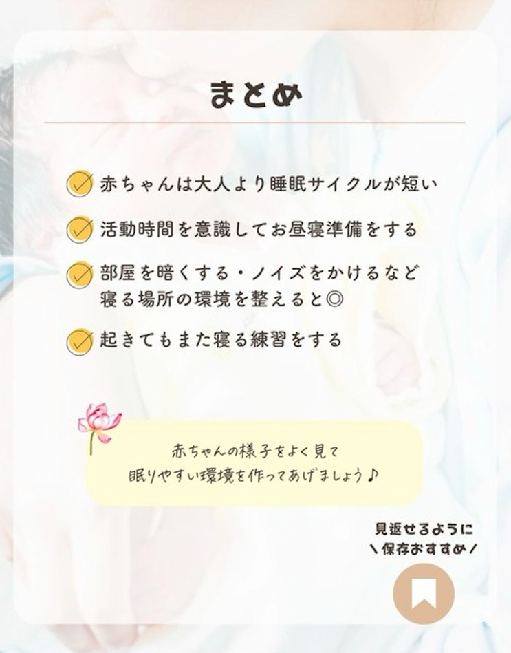 今回は、ご家庭で実践しやすい「赤ちゃんのお昼寝のコツ」についてご紹介いたします。