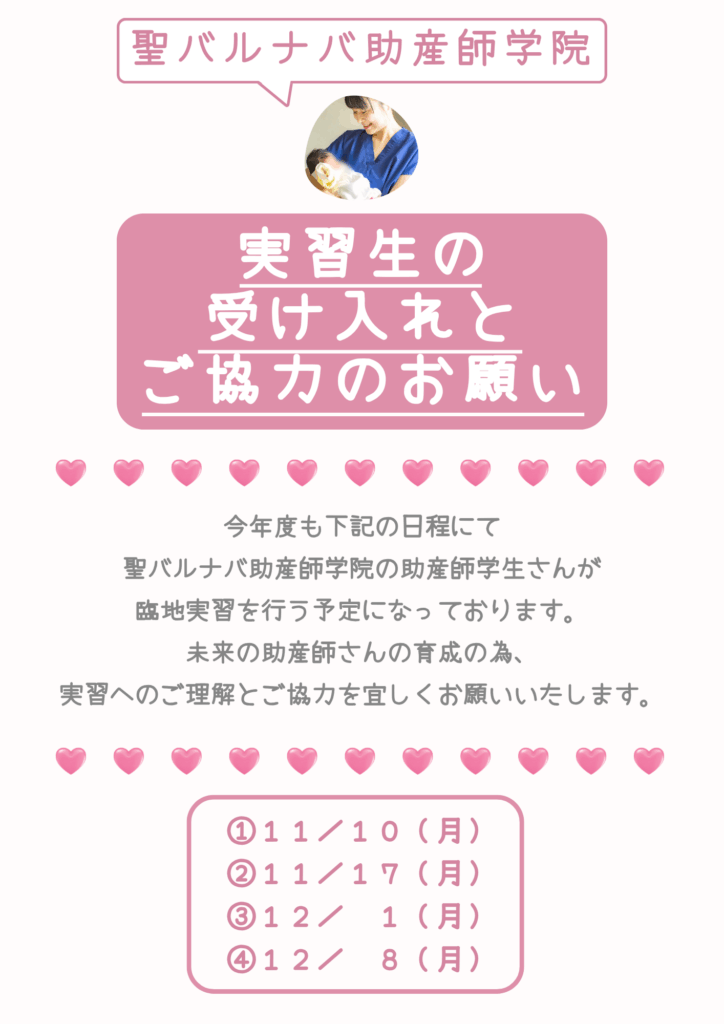 未来の助産師さんの育成の為、実習へのご理解とご協力を宜しくお願いいたします。