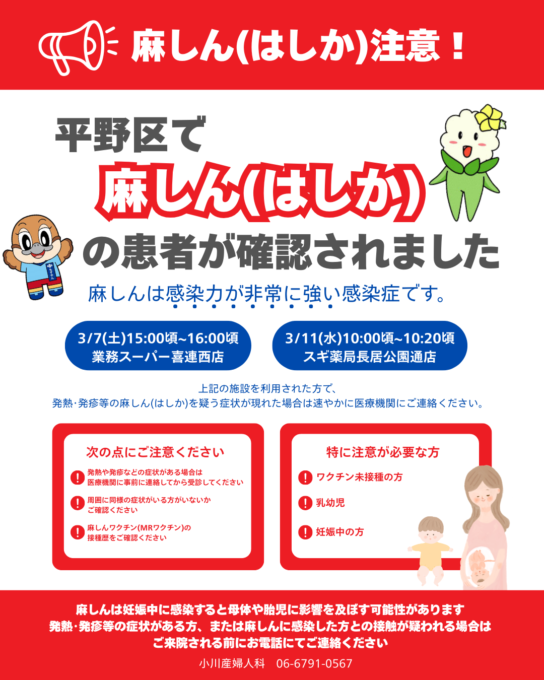 🚨平野区で麻しん(はしか)の患者が確認されました📢